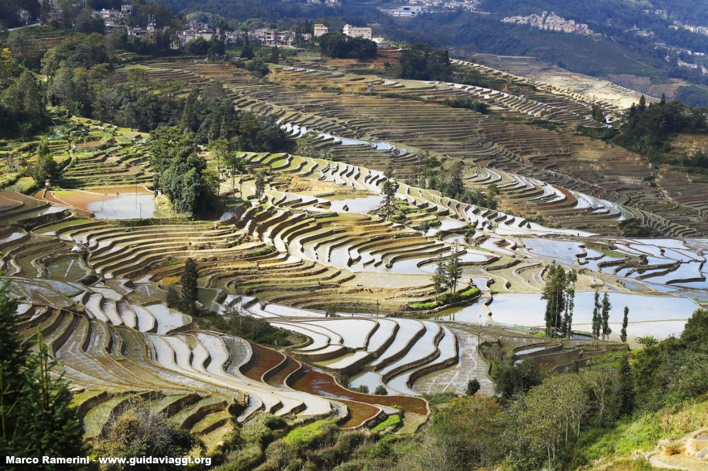 Dans la partie sud de la province près de la frontière avec le Vietnam les rizières en terrasses, qui caractérisent le territoire situé au sud de Yuanyang, représentent l’un des plus beaux paysages du Yunnan. La récolte du riz se fait en septembre/octobre. Si vous voulez admirer les rizières jaunes ocres mûres et colorées, vous devez visiter la région en septembre. Ensuite les rizières sont remplies d’eau pour les préparer au semis. Après la récolte les nuages se reflètent dans l’eau des rizières, provoquant des effets de lumière spectaculaires au lever et au coucher du soleil. Pendant les mois d’été les rizières se distinguent par leur vert intense. Cette zone, appelée “Paysage culturel des terrasses rizicoles de Honghe Hani”, fait partie du site du patrimoine mondial de l’ONUESC.